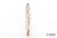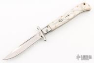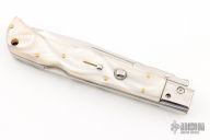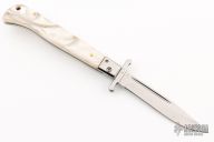 This Swing Guard Lockback Auto by AKC Italy has a polished stainless steel blade with fullers. The handle has pearlex scales with stainless steel bolsters, stainless steel liners, and stainless steel back spacer and lock.  This knife has been professionally tuned and polished by Greg's Effects.  Includes a leather sheath.  Excellent Condition.