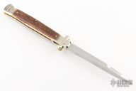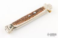 This lockback Auto by AGA Campolin has a mirror polished stainless steel spear point blade with false top edge. The handle has stag scales with mirror polished nickel silver bolsters, brass liners, stainless steel backspacer. Includes the original box and a leather slip sheath. Excellent Condition. This knife was polished and tuned by Greg Effects.