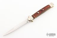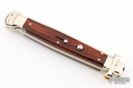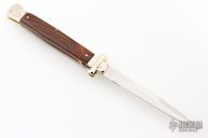 This lockback Auto by AGA Campolin has a mirror polished stainless steel spear point blade with false top edge. The handle has cocobolo scales with mirror polished nickel silver bolsters, brass liners, stainless steel backspacer. Includes the original box and a leather slip sheath. Excellent Condition. This knife was polished and tuned by Greg Effects.