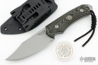 This Hide Fighter by Steve Woods and Wilson Combat features a bead blasted blade .125" black stock and 1.454" blade depth, full tang construction. The handle has black/green G-10 scales. Comes with a kydex sheath. New from maker!