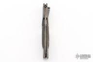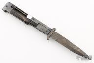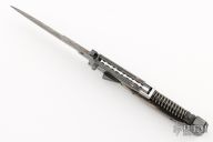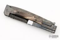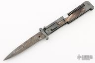 This AK-47 Auto by Agasi Hambartsumian of Armenian Doctor Knives features a Damascus blade. The handle has a blued steel frame and swing guards, buffalo horn scales with black hardware. New from maker. Fires very strong. Has an interesting mechanism. The spring on the spine of the handle is compressed when the blade is closed, and gives the spring extra power when fired.