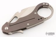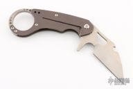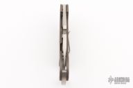This Burung by Medford features a tumble finished blade with thumbhole and flipper. The handle has a tumbled and anodized titanium frame with a tumbled titanium backspacer and a tip up reversible clip. Nice detent, lockup and blade seating. Comes with original box, case and papers. Has a few light scuffs, but otherwise in excellent condition.