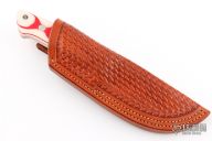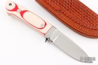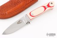 This Drop Point Hunter by Gary Martindale features ivory/red paper micarta scales with red liners and a mirror polished stainless steel guard. Full tapered tang construction with .186" blade stock and 1.067" blade depth. Mirror polished blade. Includes a hand tooled brown leather sheath with belt loop. #133 on blade and sheath. Gary's knives are incredible and this one is no exception. Comes with a zippered case. Excellent condition.
