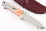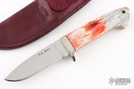 This drop point hunter by Phillip M Parris features a mirror polished blade with .175" blade stock and 1.118" blade depth, full tapered tang construction. The handle has a nickel silver guard, giraffe bone scales with nickel silver pins, black spacers and red liners. Comes with a leather sheath. Excellent condition.