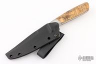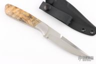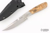 This custom fixed blade by Ron Gaston features a double-edged hand rubbed satin finish blade, full tapered tang construction with .161" blade stock and 1.013" blade depth. The handle has satin finish stainless steel dovetailed bolsters, wood scales with red liners. Comes with a kydex sheath. Has a couple light scratches, otherwise excellent condition.