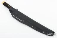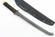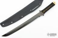 This Millennium Sword by Barry Dawson features an upswept blade with nice hamon and false top edge, .251" blade stock and 1.138" blade depth, full tang construction. The handle is comprised of black paracord Japanese style wrap over yellow paper micarta scales with mosaic pins. Includes a kydex sheath. Excellent condition.