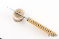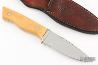 This Hunter by Jack Crain features a mirror finished drop point blade with fileworked spine, .126" blade stock and 1.165" blade depth, full tang construction. The handle has a nickel silver guard with Westinghouse paper micarta scales with black liners and nickel silver pins. Fileworked tang. Comes with a brown leather sheath. Has a few light scratches, otherwise excellent condition.