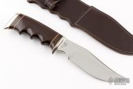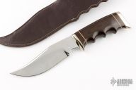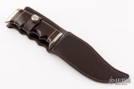This knife by J.I. Lane features a mirror polished blade with false top edge, .190" blade stock and 1.506" blade depth, hidden tang construction. The handle has nickel silver guard and butt with black linen micarta grip and white spacers. Comes with a brown leather sheath. Excellent condition.