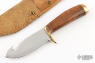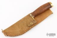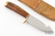 This knife by Jim Ferguson features a satin finished blade with guthook, .124" blade stock and 1.445" blade depth, hidden tang construction. The handle has a brass guard and butt with a wood grip with black/white/brass spacers. Comes with a brown leather sheath. #90 on the blade. We think that is the date. Excellent coniditon.