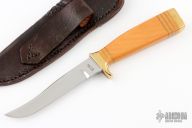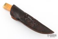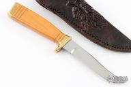 This knife by H Neeb features a mirror polished blade with .182" blade stock and .735" blade depth, hidden tang construction. The handle has a brass guard and butt with a Westinghouse paper micarta grip with brass spacers. Comes with a hand tooled black leather sheath. Excellent condition.