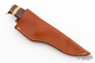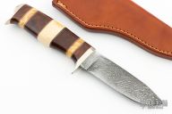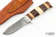 This Knife by Ken McFall features a Damascus blade with .176" blade stock and 1.149" blade depth, hidden tang construction. The handle has a nickel silver guard and butt, stacked ironwood, maple and mammoth ivory grip with black and nickel silver spacers. Comes with a brown leather sheath. Excellent condition.