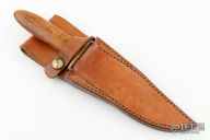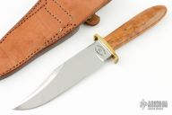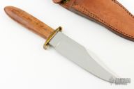 This knife by Bobby Knecht features a mirror polished blade with false top edge, .182" blade stock and 1.404" blade depth, hidden tang construction. The handle has a brass guard with maple burl grip. Comes with a brown leather sheath. Has some light scratches and patina, otherwise good condition.