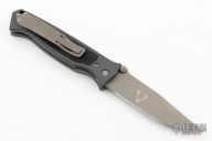 This D/A Vallotton Chameleon by Microtech is dated 5/96, numbered 762, and has the Vallotton logo on the back side of the blade. The release button for automatic opening is under the end of the clip. Has a bead blasted AEBL blade, black aluminum scales with rubber inlays, bead blasted titanium liners, tip up titanium clip. Has some light scuffs and scratches, good condition otherwise.