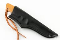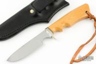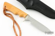 This knife y Wesley R Powell features a mirror polished blade with .154" blade stock and .974" blade depth, hidden tang construction. The handle has a nickel silver guard and Westinghouse paper micarta grip with black/white spacers. Comes with a black leather sheath. Excellent condition.