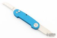 This is a push button automatic by S.W.A.T. has 2 satin finished blades. T6 blue aluminum handle with push buttons and safeties. Comes with original box. Excellent condition.