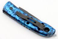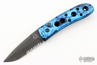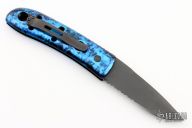 This is a Woodard Knives Fer De Lance side opening automatic with a serrated black coated blade and anodized aluminum frame. Stainless steel clip, tip up carry. Excellent condition. Comes with original sheath.