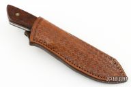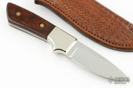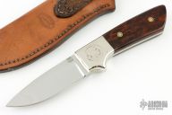 This knife by RD Nolen features a mirror finished blade with .160" blade stock and 1.233" blade depth, full tang construction. The handle has dovetailed nickel silver bolsters ironwood burl scales with mosaic pins. Comes with a hand tooled brown leather sheath. Has a buffalo nickel in the bolster. Has a few very light scratches, otherwise excellent condition.