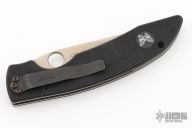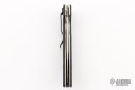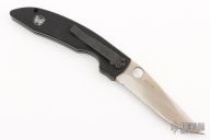 This 800S Linerlock folder by Benchmade has a satin finished blade with partial serrations, thumb hole, and notched thumb rest. Handle is black G10 over titanium liners, black fiber back spacer, lanyard hole, and black stainless steel tip down clip. Excellent condition. Comes with original box and papers.
