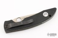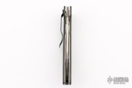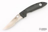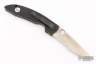 This 800S Linerlock folder by Benchmade has a satin finished blade with partial serrations, thumb hole, and notched thumb rest. Handle is black G10 over titanium liners, black fiber back spacer, lanyard hole, and black stainless steel tip down clip. Excellent condition.