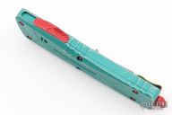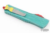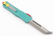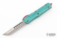 This Combat Troodon Bounty Hunter by Microtech Knives features a Hellhound tanto blade with fullers, satin flats and apocalyptic finished grinds. The handle has a green battle worn aluminum handle with red hardware, tip down apocalyptic finished stainless steel clip. Dated 02/2023 s/n 2976. Includes the original box and papers.  Excellent condition.