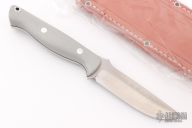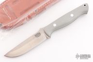 This Gunny by Bark River Knives features a satin finished blade with notched thumbrest, .158" blade and .946" blade depth, full tang construction. The handle has battleship gray G-10 scales with black G-10 liners and aluminum pins. Comes with a brown leather sheath and original box. Excellent condition.