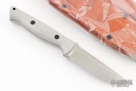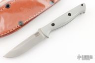 This Mini Gunny by Bark River Knives features a satin finished blade with notched thumbrest, .129" blade and .858" blade depth, full tang construction. The handle has battleship gray G-10 scales with black G-10 liners and black canvas micarta pins. Comes with a brown leather sheath and original box. Excellent condition.