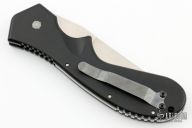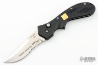 This Worden/Crawford designed WorTac side opening automatic from Al Mar Knives features a polished tumble finished serrated blade with false top edge. The handle has a black aluminum frame and blasted aluminum backspacer, tip up stainless steel clip. Fast action. Comes with original box. Has a couple light scuffs, otherwise excellent condition.