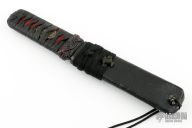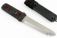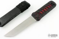 This Kwaiken by Phill Hartsfield features a satin finished chisel ground tanto blade, .127" blade stock and 1.216" blade depth, hidden tang construction. The handle has epoxied cord wrap over red cord. Has a PH menuki. Comes with a paper lined, black leather covered metal scabbard. Excellent condition.