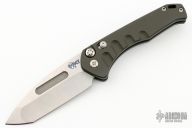 The Praetorian Swift Auto by Medford Knives features a tumbled tanto blade with large fullers. The handle is composed of anodized and tumbled aluminum and features a lanyard hole in the pommel and a anodized titanium tip up pocket. Satin hardware. Has some light scuffs, otherwise excellent condition.  Comes with hard case.
