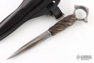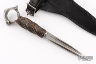 This dagger by Paul Cooper has a square fluted dagger blade that is satin finished, .450" thick at the guard, hidden tang construction. The handle has forged steel guard and ring at the butt with a spiral fluted wod grip with twisted copper wire inlays. Comes with a black leather sheath. Excellent condition.