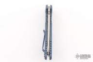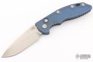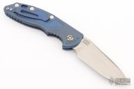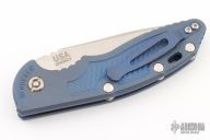 This XM-18 Flipper by Rick Hinderer Knives features a 3.5" stonewashed finish blade, notched thumbrest and flipper.  The handle has a Battle Blue titanium frame with a matching tip up pocket clip.  Comes with original box and papers. New condition.