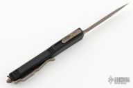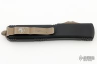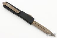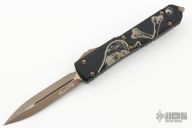 This Ultratech OTF from Microtech features a tanto blade profile and a collectible death card graphic. The blade has a durable bronze apocalyptic finish and a Memento Mori stamp. This model depicts the right half of the Death Card. Microtech equipped this version of the ever popular Ultratech D/A OTF knife with a smooth, contoured handle design that promotes increased comfort during use. This updated model provides the same dimensions, hardware, and durability offered by the "Tri-Grip" variation, but goes easier on the hands and pockets. For those unfamiliar with the Ultratech, it's a fully automatic knife with a double-action out-the-front mechanism, meaning the thumb slide deploys the blade and retracts it as well. The Ultratech knife from Microtech has set the bar for all OTF knives. Excellent condition with original box and papers. Dated 01/2021 s/n 011