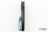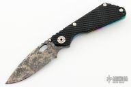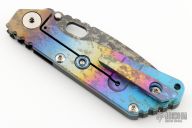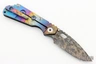 This SNG framelock folder by Mick Strider features a digicam blade and a dimple pattern black G-10 and custom anodized digicam titanium frame and tip up deep carry LynchNW titanium clip. Includes a "Lock Bar Stabilizer" for maximum reverse lock retention. Nice detent, lockup and blade seating. Has been resharpened, otherwise excellent condition. Comes with a zippered case. Has a Grays Precision Zirconium Blue Line lockbar stabilizer, Ti Bright hardware. Comes with original hardware as well.