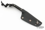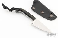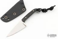 This Pocket Knife by Fred Perrin features a mirror polished drop point blade with notched thumbrest, .118" blade stock and .745" blade depth, full tang construction. The handle is comprised of black linen micarta with nickel silver pins. Lanyard hole with lanyard in pommel. Includes kydex sheath and a zippered case. Excellent condition.