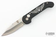 This Slim Seal Auto Limited Edition #096 from Rob Dalton has a bead blasted spear point blade with satin finished flats, false top edge and a file worked blade spine. Handle is black aluminum with tip up titanium clip.  Great Dalton action. Numbered #096 on pommel. Has a couple light scuffs and scratches, excellent condition otherwise.