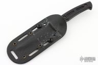 This Massad Ayoob "Razorback" by Masters of Defense has a black coated tanto partially serrated blade with fullers, .177" blade stock and .637" blade depth, hidden tang construction. The handle is black coated aluminum. Comes with a black kydex sheath. Has some scuffs/scratches, has been resharpened, otherwise good condition. Sheath has some tape residue.