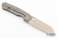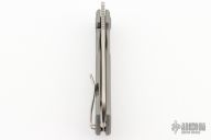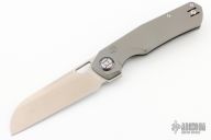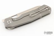 This knife by Kunwu Knives features a satin finished blade with notched thumbrest and flipper. The handle has a textured titanium frame with matching backspacer and tip up clip, mokuti pivot collar. Comes with original box and papers. Excellent condition.