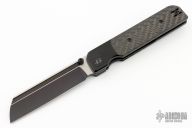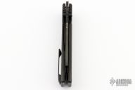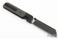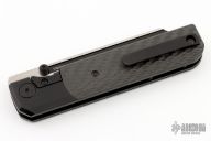 The DLC coated titanium bolster lock is paired with classic weave carbon fiber inlays, DLC hardware and the Knife Standards DLC coated milled titanium clip.