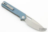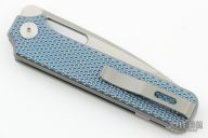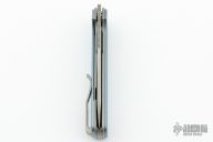 This Standard by Golden Designworks features a two-tone blade with thumbhole and notched thumbrest. Works well as a front flipper. The handle has milled and anodized titanium scales, bead blasted titanium liners, backspacer and tip up clip. Comes with original box, zippered case and papers. Excellent condition.
