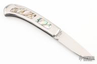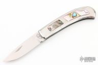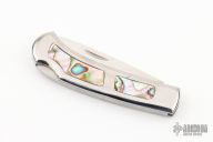 This Interframe Lockback by AG Russell features a mirror polished blade with nail nick. The handle has a stainless steel frame with abalone inlays. Has some light scratches, otherwise good condition.