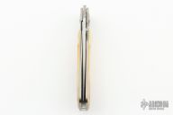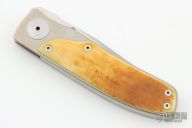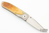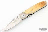 Designed by Michael Walker and made by Hans-Peter Klotzli in Switzerland. This linerlock folder features a clip point satin finished blade with a false top edge and a single thumbstud. The handle has a satin finished titanium frame with bark mammoth ivory overlays, titanium liner. Nice detent, lockup, and blade seating. Can be opened like a front flipper. Comes with a leather slip sheath. Has a few light scratches, otherwise excellent condition.