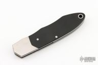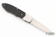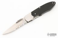 This Spyderco Solo 2000 Micarta Gentleman's Knife. It has a satin finished partially serrated blade with thumb lug. The handle has stainless steel bolsters and liners, black paper micarta scales. Has a few light scratches, otherwise excellent condition. Rare.
