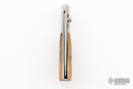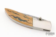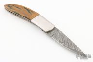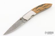 This knife features a Damascus blade with single thumbstud. The handle has stainless steel bolsters, mammoth ivory scales, stainless steel liners and backspacer. Has some scratches, otherwise good condition.