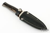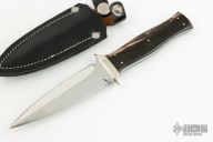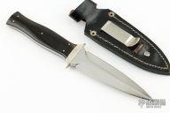 This dagger by Walter Brend features a mirror polished double-edged blade, .182" blade stock and .978" blade depth, full tapered tang construction. The handle has a nickel silver guard with Cape Water Buffalo horn scales. Comes with a black leather sheath and a zippered case. Has some light scratches, otherwise excellent condition.