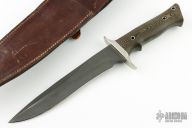 This Model 2 features a double hollow ground blade with a black oxide finish and sharpened top edge. .263" blade stock and 1.415" blade depth, full tang construction. The handle has a bead blasted titanium double guard, and black/green linen micarta scales. Comes with a brown leather sheath. Old style "Brend" blade stamp. Walter no longer makes knives with the black oxide finish. Has a few light scratches, otherwise excellent condition.