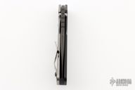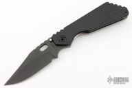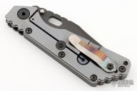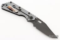This Mick Strider SMF Bowie framelock folder features a black blade with thumbhole and notched thumbrest. The handle has a black aluminum and an anodized titanium frame with titanium clip, tip up carry, lockbar stabilizer. Jimping on blade spine. Nice lockup, detent, and blade seating. New condition. This knife came to us on consignment.
