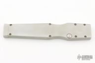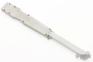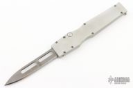 This Ranger OTF Single Action Automatic by Rob Dalton features a bead blasted spear point chisel ground blade. Blade says "Seal Team" on one side and "Military Only" on the other. The handle is comprised of a silver aluminum with push button and black charging handle on pommel. Has a few scuffs, otherwise excellent condition.