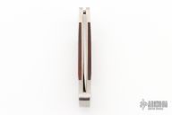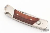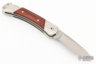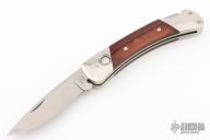 This Buck 500 Duke Auto Conversion features a satin finished drop point blade. The handle has a stainless steel frame with wood scales. Comes with black leather belt sheath. Has some light scuffs and scratches, great condition otherwise.