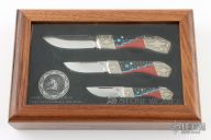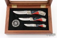 This Custom Lockback set by David Yellowhorse and is from a limited edition of 100 pieces. The blade features a longpull with straightback blade. The handle has nickel silver bolsters, ironwood, turquoise, red and black spiny oyster shell and nickel silver spacers, brass liners and stainless steel backspacer. Comes with original wooden display box.