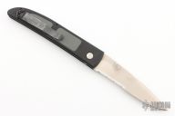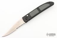 The 3000s automatic from Benchmade is a discontinued model designed by Mel Pardue. Side opening, coil spring. Satin finish partially serrated blade, black aluminum frame with rubber inlays and a tip up stainless steel clip. Has a couple scuffs, otherwise excellent condition.
